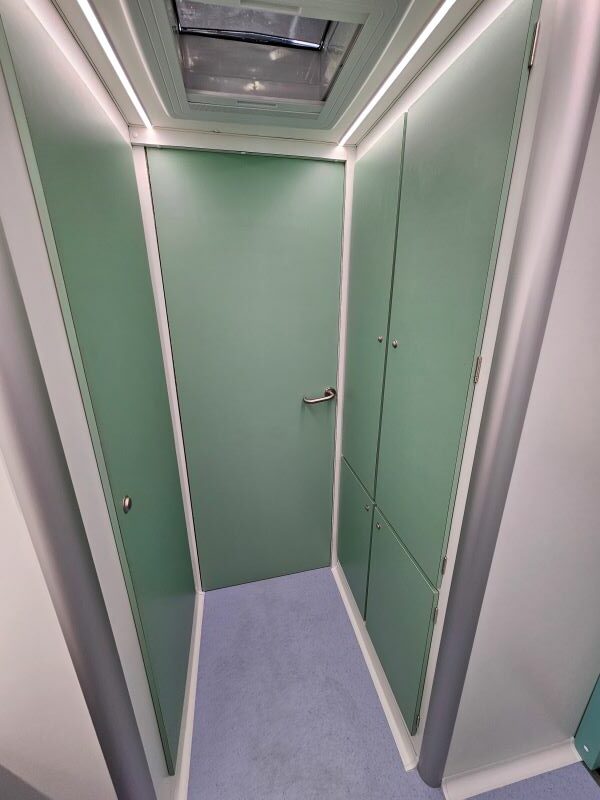 Scocca in vetroresina monoblocco in stampo unico doppio guscio isolata in poliuretano con controtelaio e barre antintrusione,2 porte d’ingresso molto robuste larghezza 80cm con maniglioni antipanico.