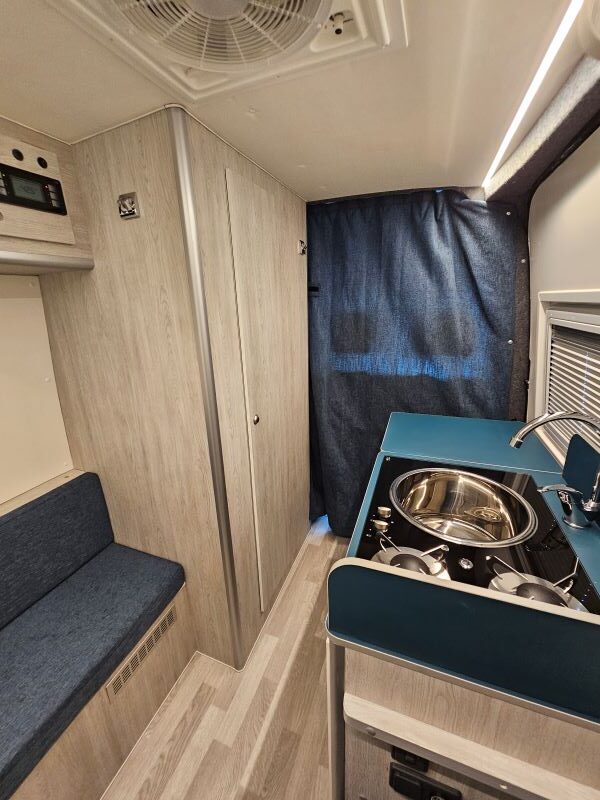 Allestimento: Mobili in compensato rivestiti in PVC a scelta dal campionario, frigo compressore 50Lt., wc Clesana , 1 batterie AGM 100 A, cucina 2 fuochi, lavello inox, impianto luci a led, vano doccia.
