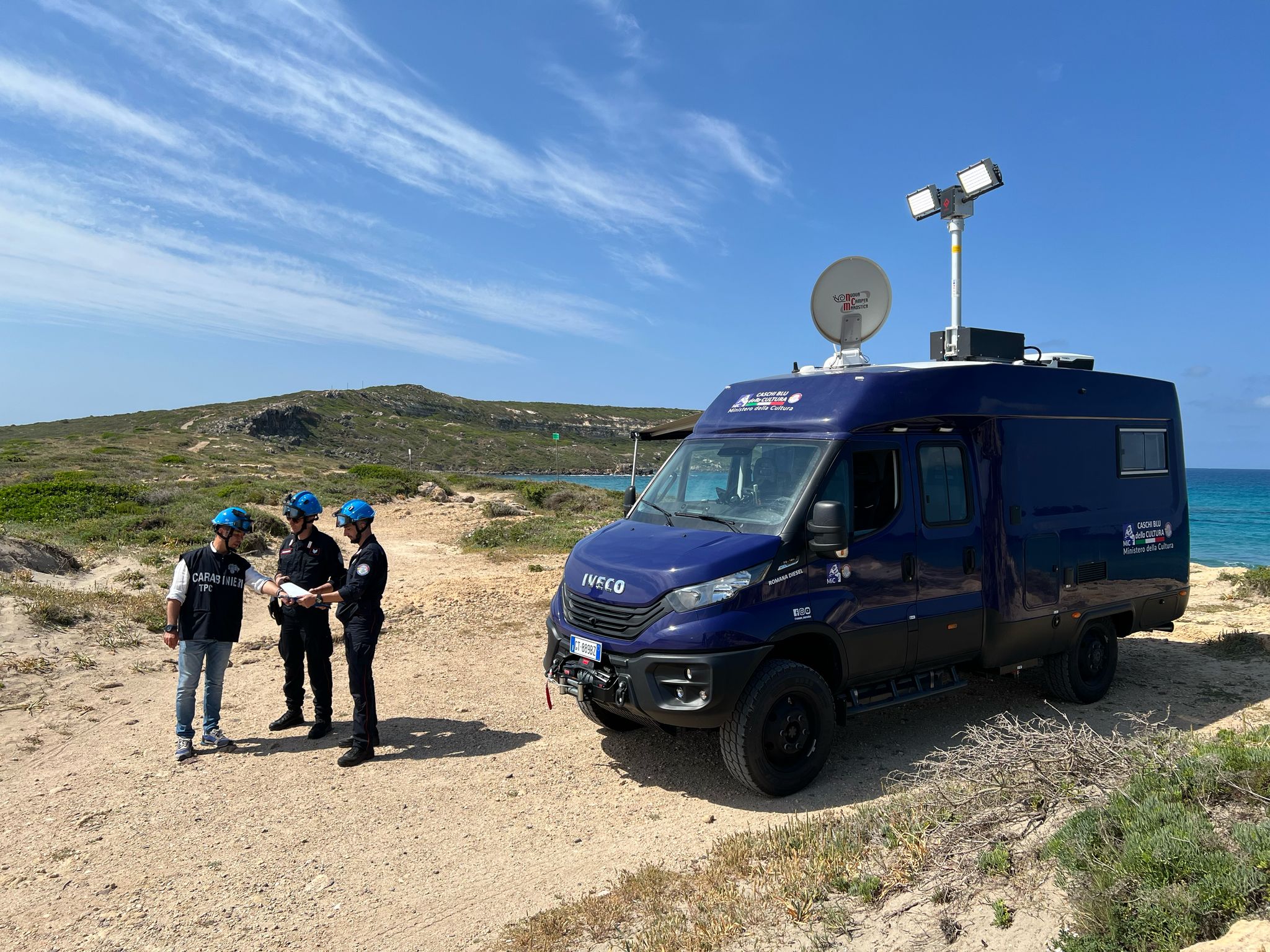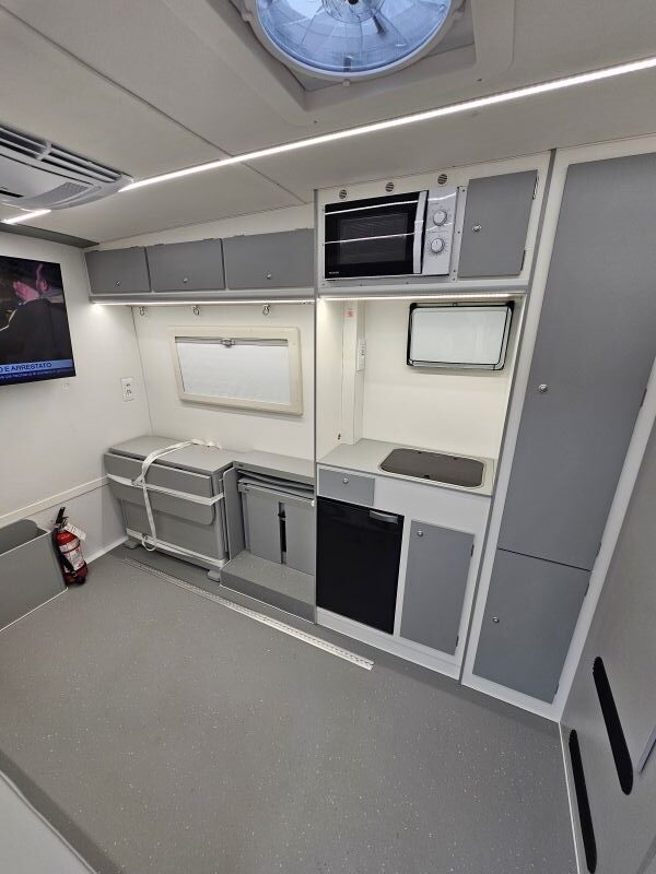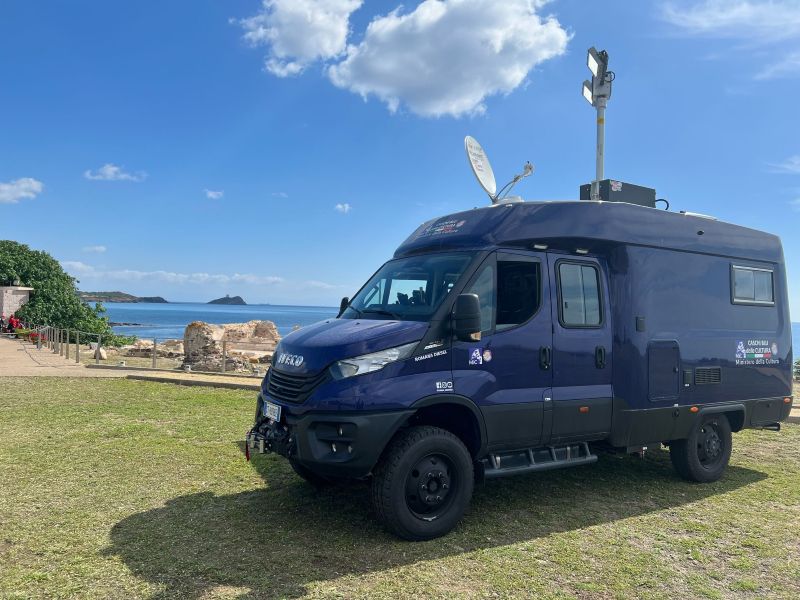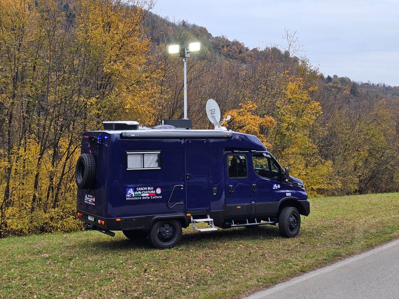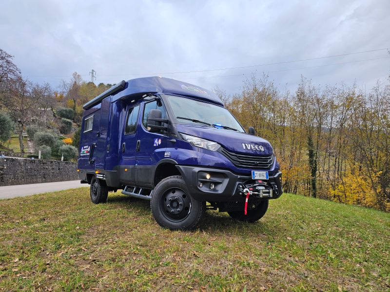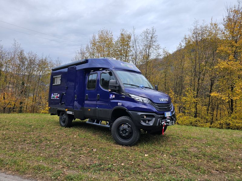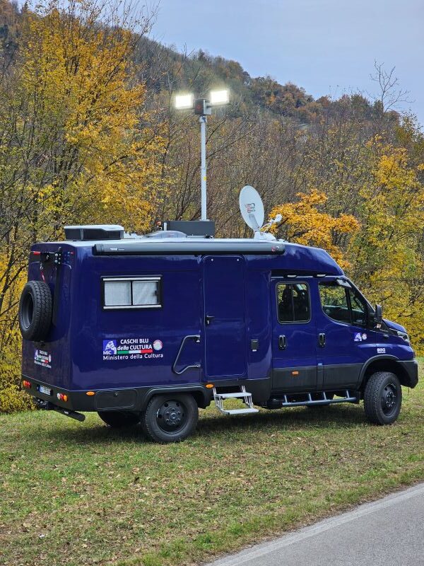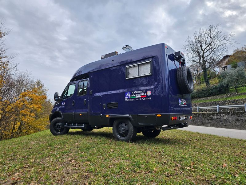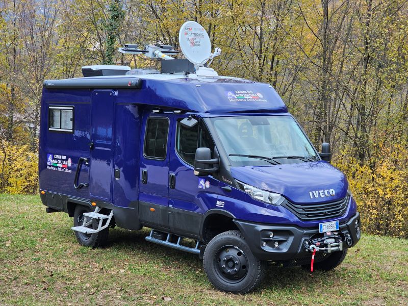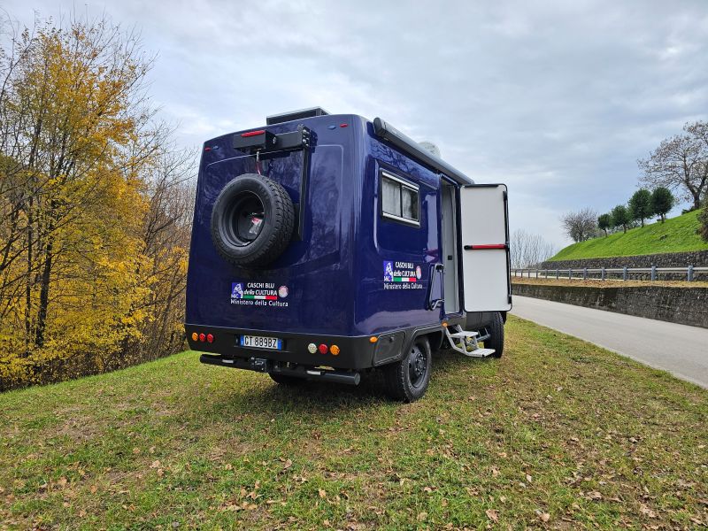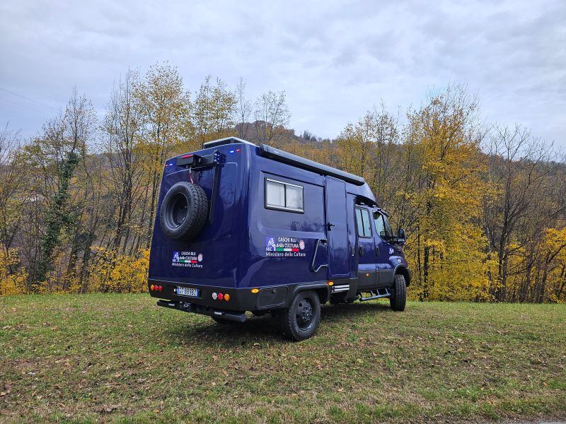 Per il nucleo dei Carabinieri TPC Tutela Patrimonio Culturale con il patrocinio del Ministero della Cultura abbiamo realizzato un Ufficio Mobile su base Iveco Daily 70 180 4×4 doppia cabina con 7 posti viaggio per il trasporto di tutti i componenti della Missione , e abbiamo installato la Nostra Esclusiva Carrozzeria monoscocca dal designe unico e al Suo interno lo abbiamo strutturato come ufficio mobile polifunzionale , in quanto può ospitare per call , meeting , formazione , briefing fino a 10 persone , dotato di riscaldamento autonomo , acqua calda istantanea, smart Tv , rete internet, impianto al litio da 300A con inverter da 3kw , gruppo elettrogeno da 2.9kw , tendalino elettrico , compressore , ruota di scorta con vericello automatico , vericello anteriore WARN , antenna TV satellitare , Torre Faro pneumatica e tanto spazio di stivaggio . Un veicolo unico nel Suo genere adatto ad ogni tipo di terreno e situazione.