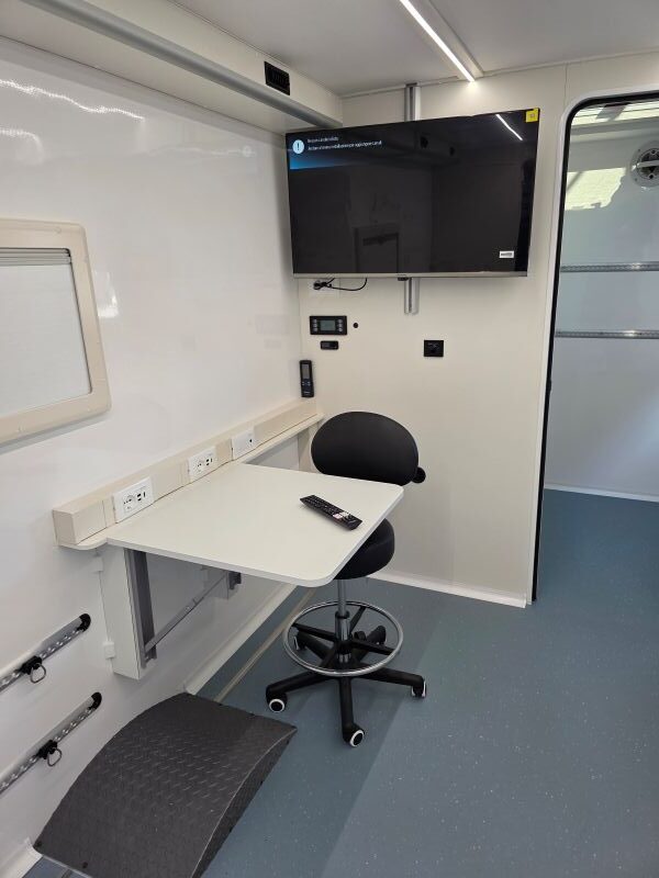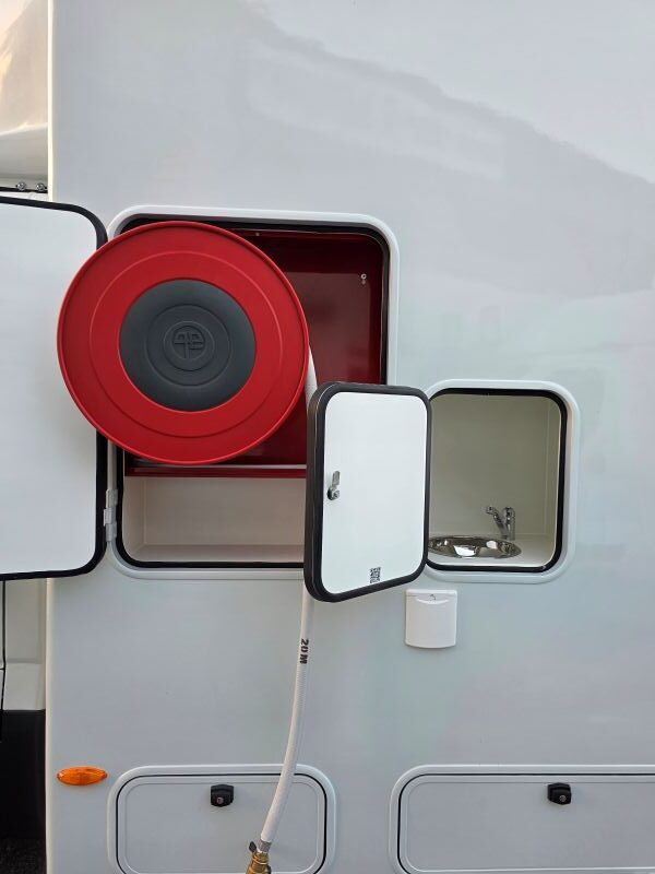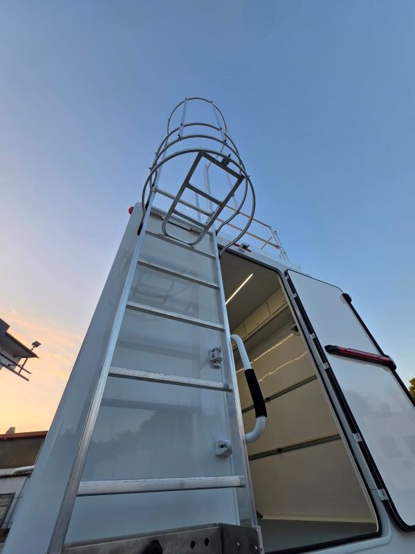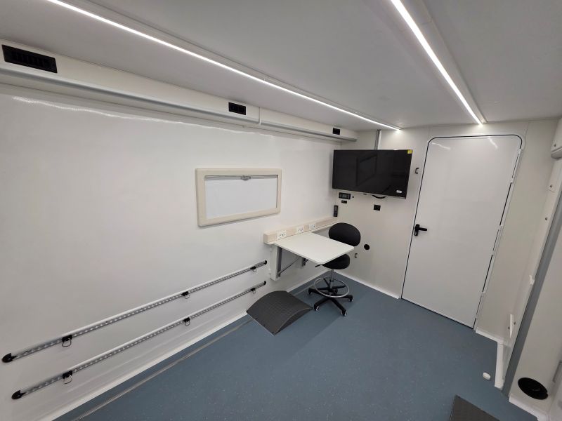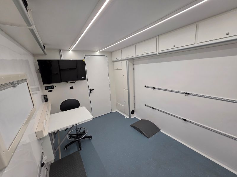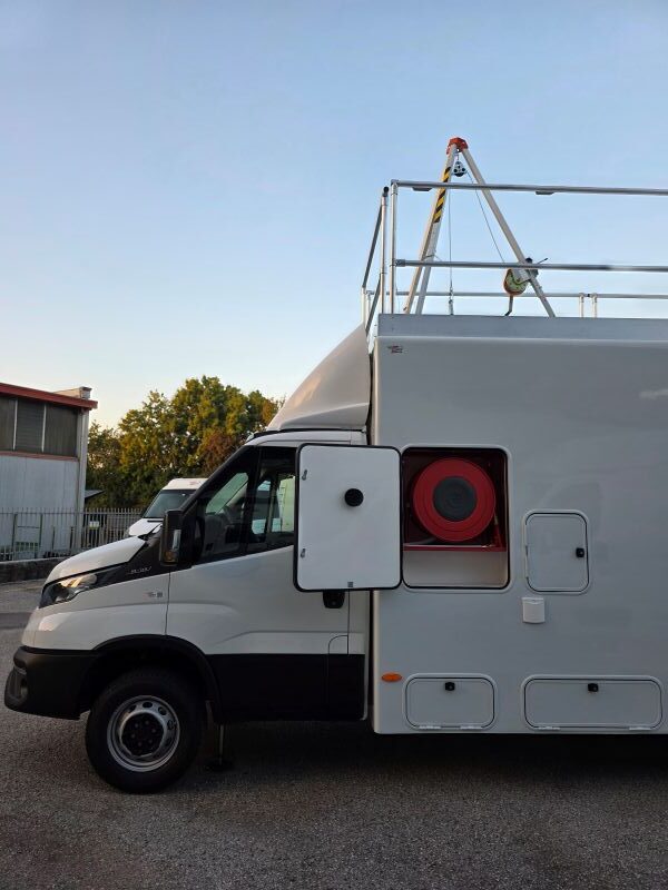 Il veicolo è stato suddiviso in 2 Stanze , la più grande come aula con scrivania e monitor , la seconda come stanza per prove di confinamento con discesa dal tetto mediante vericello, stanza dotata di telecamera WiFi che proietta in diretta agli allievi all’esterno/interno del veicolo , ringhiera parapetto a tetto omologata, scala a gabbia posteriore amovibile per la salita a tetto , ganci per la sicurezza sul tetto , vano esterno con 1 lavabo e rubinetto , 1 vano esterno per prove manichette antincendio.