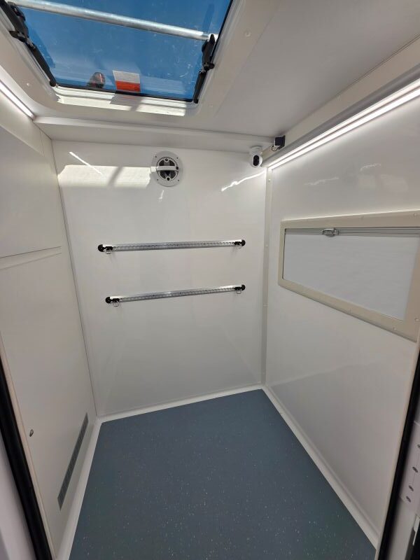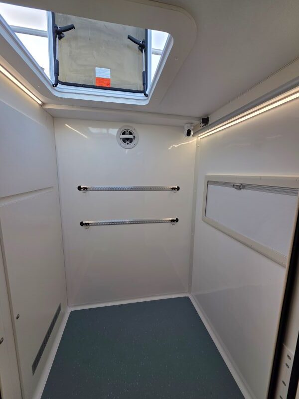 Carrozzeria MonoScocca in vetroresina monoblocco in stampo unico doppio guscio isolata in poliuretano con controtelaio e barre antintrusione,1 porta d’entrata larghezza 90cm con maniglione antipanico.